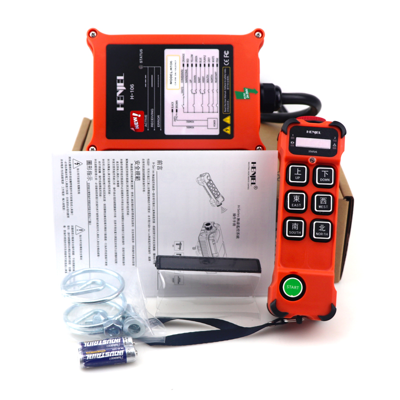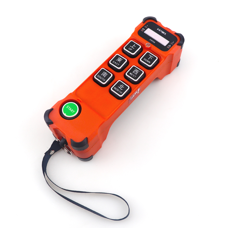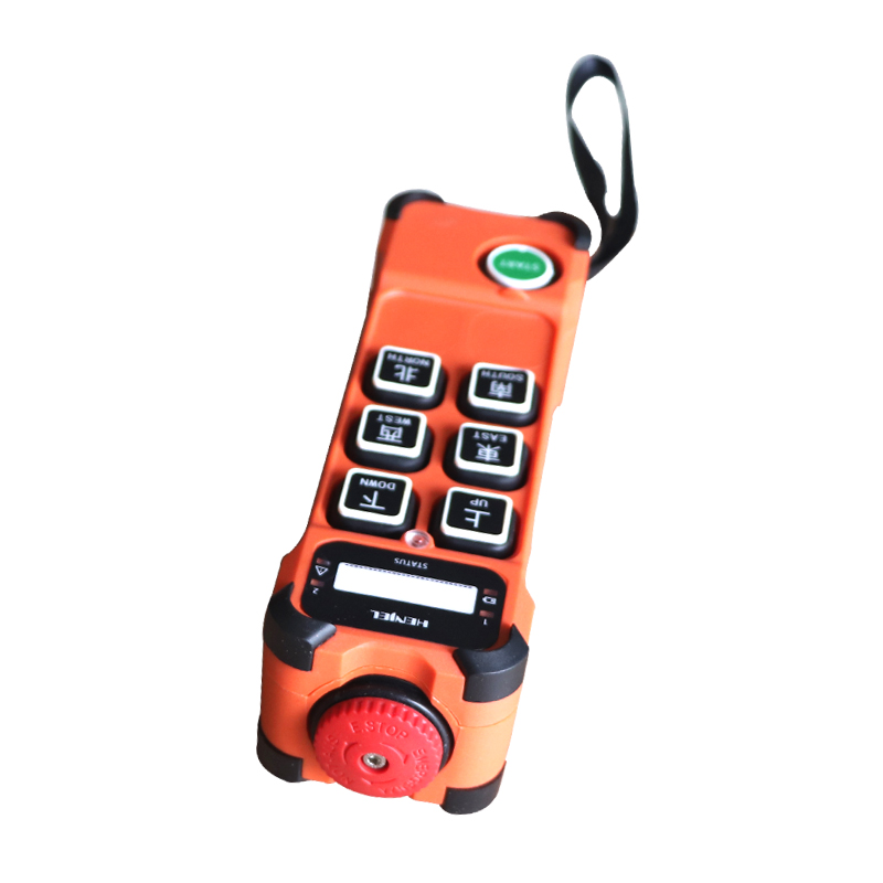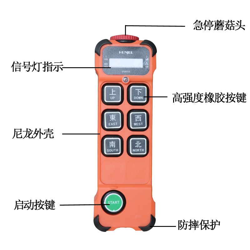 H106型工业无线遥控器,拥有6只功能按键、独立的启动按钮和欧规蘑菇头急停。
