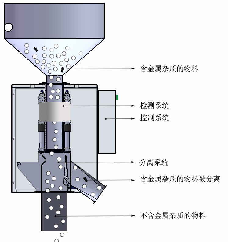 ◆原料从料斗或送料器自由下落通过金属分离器,如没有金属杂质,原料会直接通过金属分离器感应区直下储料箱,如果探测器检测到原料中有金属,则分流阀门就会动作,把带有金属及少部分原料分流出来,然后分流板迅速回复到正常位置,分流板速度可调,感应精密根据生产需要可调,即使小至0.4MM的金属粒子也能检测到且分离出。