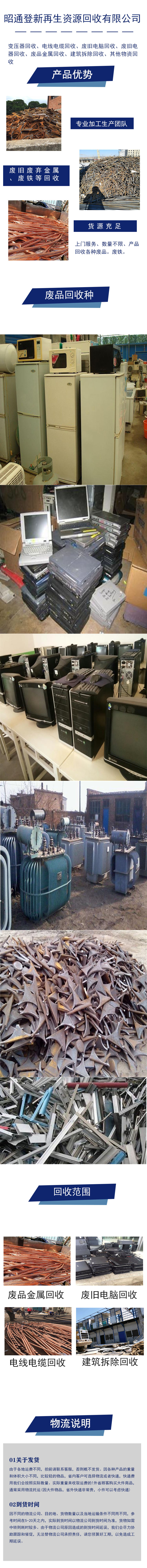 昭通登新再生资源回收有限公司长期高价回收各种再生物资的专业回收公司,公司自成立至今,一贯严格遵守:以价优为基础,公平求生存,以信誉作保证 的服务宗旨,以良好真诚的态度对待每一个客户。
