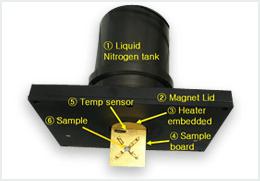 样品变温、固定部分组成 - 圆形液氮槽 - 样品固定板 - 温度传感器 - 嵌入式加热器 - 磁体盖 - 电缆 | AMP磁体Kit俯视图 - 磁体移动马达控制 - 圆形液氮槽 - 磁体盖 - 电缆 |