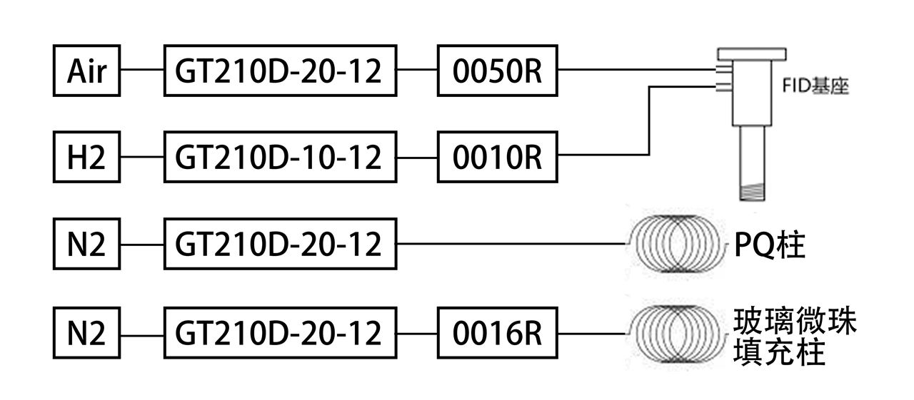 氮气2:氮气2选用EPC型号为GT210D-20-XX,搭配0016R气阻和玻璃微珠柱使用。0016R气阻与玻璃微珠填充柱串联使用,可使总气阻约等于PQ柱气阻,防止切换多通阀时流量突变导致FID熄火。将EPC设定在20-30psi时,输出流量约30sccm。