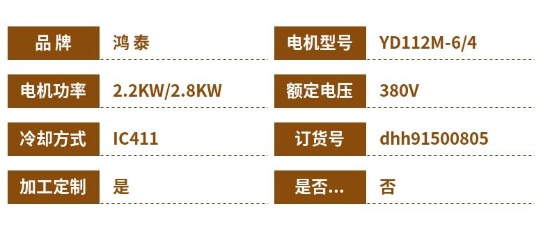 鸿泰YD双速电机YD112M-6/4 2.2KW/2.8KW效率高冷却方式IC616 电机型号 | YD112M-6/4 | ||