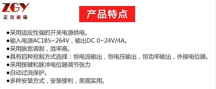 KTC800A手动张力控制器,由高速微处理器和大功率开关电源构成,可工作于恒流,恒压,恒功率(恒扭矩)等三种模式,能自动补偿离合器/制动器的热衰减,力矩输出稳定可靠。最大输出电流可达4A。KTC800A手动张力控制器可以方便实现薄膜印刷加工,绕线机等需要控制张力机器的高精度稳定控制。