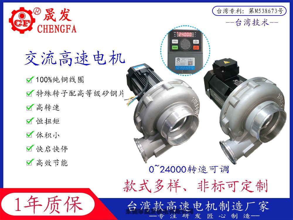 高速电机俗称特殊电机、特殊三相异步电机,电机优点是高转速,高速电机的转速通常在3000转/分及以上、高速电机具有:1)设计理念、角度、技术参数不同,采用纯铜转子,功率密度大;2)高转速,无磁性、无碳刷、与永磁电机结构大不一致,体积会远小于普通电机,是普通电机的1/3,可以更多有效的安装空间;3)具有瞬启、瞬停、恒转矩;4)传动效率高,节能降耗且环保,低噪音等特性。