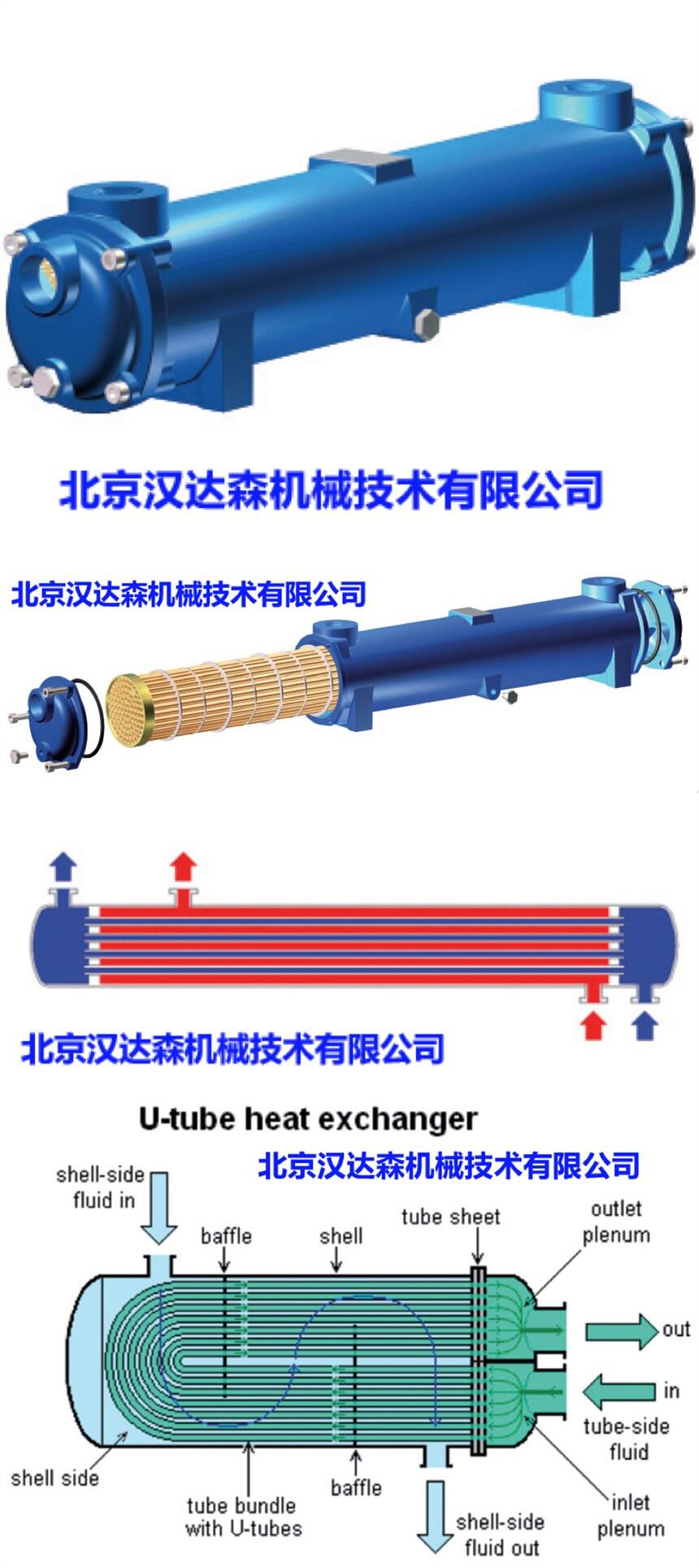 两种不同起始温度的流体通过热交换器流动。一个流过管子(管子侧)和管子外的其他流动但在壳体内(壳侧)。热量通过管壁从一个流体传递到另一个流体,从管侧到壳侧,反之亦然。流体可以是壳体或管侧的液体或气体。为了有效地传递热量,应该使用大的传热区域,因此有许多管子。通过这种方式,可以产生废热使用。这是节约能源的好方法。每侧仅具有一相(液体或气体)的热交换器可称为单相热交换器可用于加热液体以将其煮沸成气体(蒸汽),有时称为锅炉,或冷却蒸汽冷凝,它变成液体(称为冷凝器),相变通常发生在壳侧。蒸汽机中的锅炉通常是大型,通常为圆柱形的管壳式换热器。在具有蒸汽驱动涡轮机的大型发电厂中,壳管式冷凝器用于将离开涡轮机的排出蒸汽冷凝成冷凝水,冷凝水可以再循环回来变成蒸汽,可能变成管壳式锅炉。壳体和管子设计可以有许多变化。通常,每个管的末端连接到压力通风系统(有时称为水箱或港口)通过管板上的孔。管可以是直的或弯曲成U形,称为U形管。下面的草图显示了一个典型的U型管换热器,其所有组件都已识别: