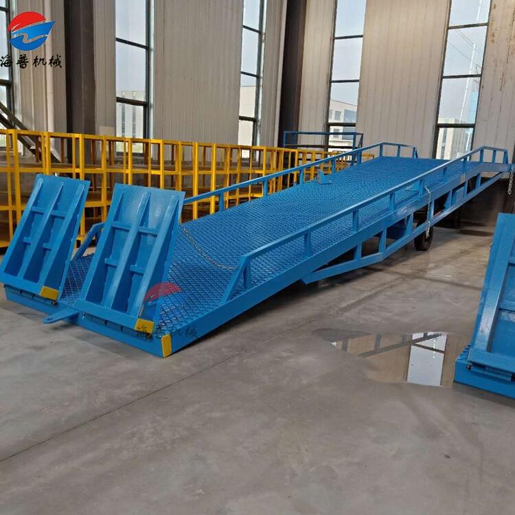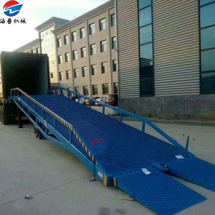 移动登车桥用于邮政、工厂等有站台的仓库、货厂等大吨位批量装车,具有安全可靠效率高等特点。DCQY型为手摇变幅式,用手摇泵操作,不用电源就可使桥板实现变幅;广泛用于无装卸设备和装卸货台的流动装卸场所;是一种安全可靠、省时、省地、解决高位差作业的高效物流机械。登车桥的主要作用是在仓储货台与运输车辆之间搭起一座斜桥,以便叉车行驶直接出入车厢进行货物装卸,该产品广泛应用于码头、站台、仓库等地。我公司可根据用户的不同需要,在外形尺寸,承受载荷等方面作特殊设计。登车桥安装在货台的侧面,与货台地面和侧面齐平。登车桥的桥板可上、下倾斜,其外端可高出或低于货台平面,使之与车厢等高。桥板的顶端有一翻板,自动搭在车厢边缘,使货台与车厢平稳过渡。