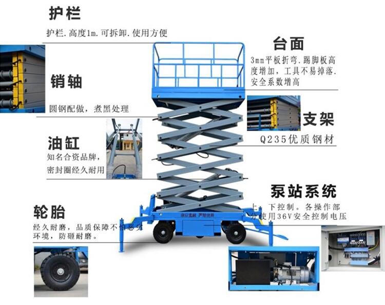 移动式升降机为四轮移动行走,垂直升降,其剪叉主结构采用上海宝钢锰钢矩形管制作,工作台面宽大,结构