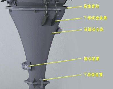 2、悬挂活振动物料仓,可根据不同物料仓的设计形式设计成圆锥体、方椎体、方变圆等不同形式以单级、双级悬挂结构,振打电机安装在仓体中部。整个仓体采用悬挂组件悬挂在固定斗体下方,密封方式采用柔性密封,在振动电机的作用下,物料能够快速通过,进入下层装置。