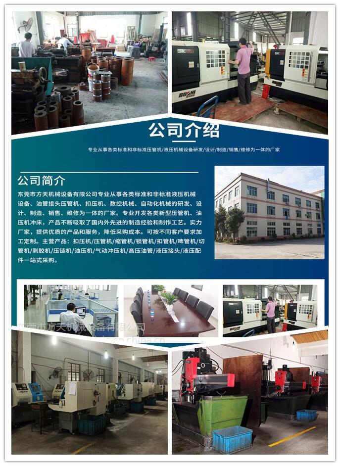 方天机械设备有限公司产品主要经营:压管机、缩管机、扣压机、切管机、剥胶机、试压泵、高压油管和接头等产品。设备适应途径:挖掘机修理厂、汽车修理厂、农机管、建筑管、大棚管、钢丝绳、焊机、煤矿、油田、船舶等工程建筑与工程车辆。
