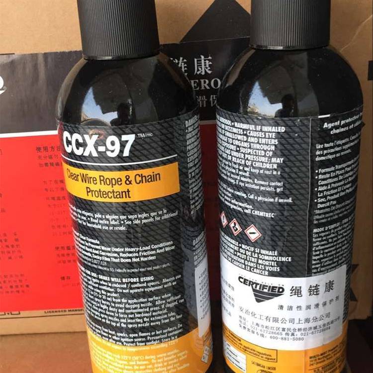 绳链康CCX-97绳链渗透润滑保护剂。清洁、环保型配方。内含有可溶性有机钼SOLUMOL 添加剂,有机钼保护层会进入绳索的丝股之间和链条的链轴和轴套联接处,减少摩擦和磨损,在高温、磨损、拉伸的情况下对金属起到保护作用,延长绳、链寿命。连续使用温度范围-20℃-100℃。