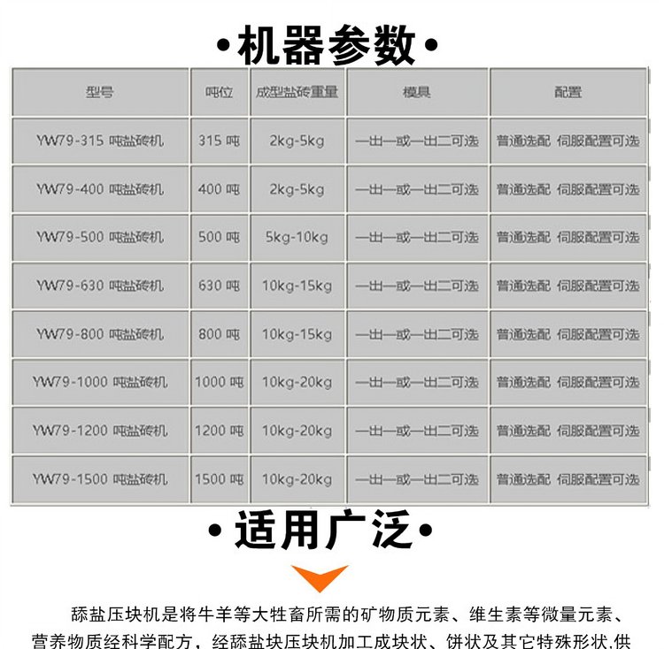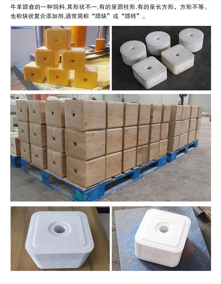 舔盐压块机是专业生产牛羊舔盐块的设备,适合大型畜牧农场,对牛羊等牲畜的健康成长具有良好的作用。本机为四柱式液压机,采用优化的液压传动方案,plc可编程控制器自动控制,因而具有强大的动力,精确的定位和完美的动作组合。本机故障率低,发热少,生产率高,节电耐用。