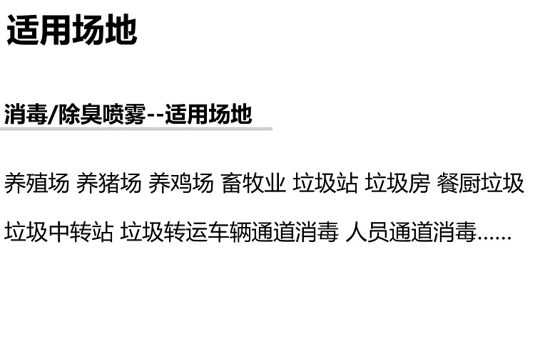 适用领域 | 餐厨垃圾 养殖场 养猪场 养鸡场 畜牧业 垃圾站 垃圾房 垃圾中转站 垃圾转运车辆通道消毒 人员通道消毒…… | ||