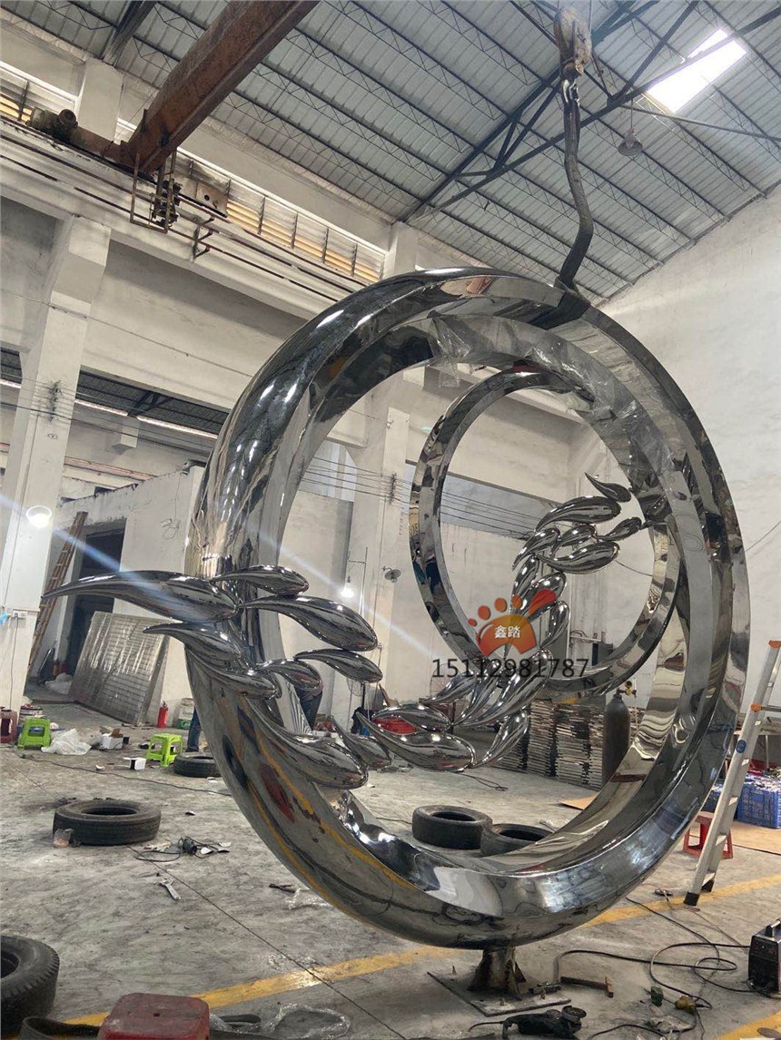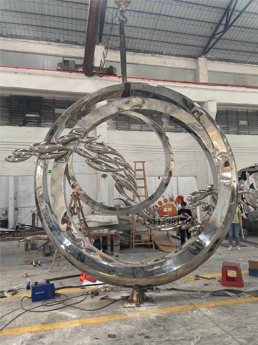 不锈钢圆环雕塑制作工艺流程:泥稿小样→骨架放大→板材锻造→镜面抛光→内置灯带。不锈钢雕塑厂家提供月亮雕塑设计、制作及安装一站式服务,可定制规格、款式及表面处理,亦可定做安装喷头,形成“水帘”不锈钢雕塑。