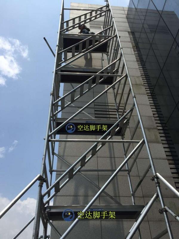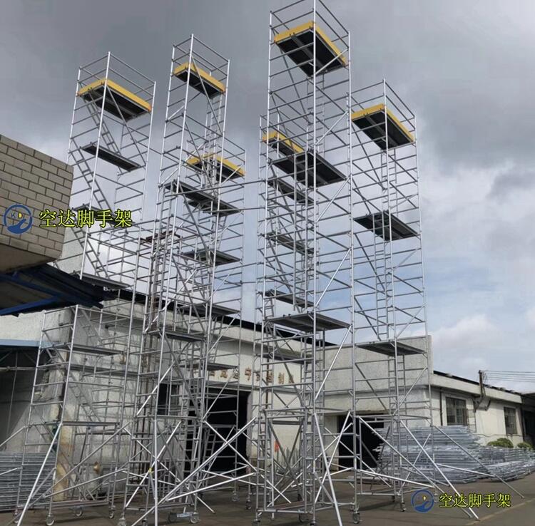2.需要攀爬的高度是多少。由于铝合金移动脚手架本身可以90度直爬,如果爬个3-5米是不难的,但如果遇到十几米甚至二三十米的高度时,靠直爬梯爬到移动铝脚手架顶部就比较累了,正常就算爬上去了也要休息一会才有力气继续施工。所以如果移动铝脚手架超过6米的使用者可以根据实际需要加选内斜爬梯。