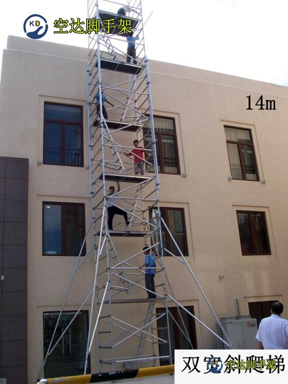 空达铝合金楼梯脚手架可以在地面不平的阶梯、楼梯等位置安全稳定地搭建到十多米高,甚至可以根据客户需要搭建到二十多米高的位置供客户解决高空作业维修维护工作。