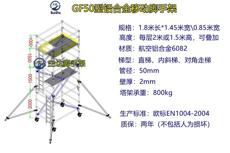 2、结构牢固,比传统脚手架结构设计科学先进,传统门式脚手架结构中间留空,结构受力不均匀,靠竖向力支撑,横向力断开了,简陋的结构导致受力很差,搭建超过6米高就很不稳定,摇晃得厉害。而铝合金脚手架使用全横向和竖向结构,整体横向和竖向都可以受力,结构牢固。由于铝合金脚手架自身重量轻,结构牢固,搭建可达几十米高依然稳定可靠。