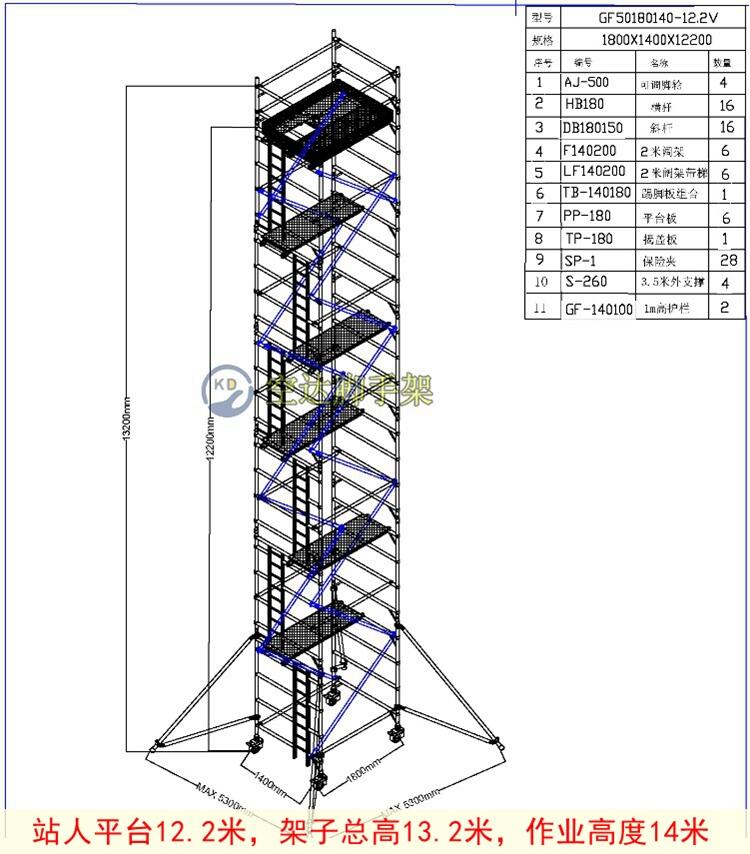 铝合金脚手架款式众多,能够满足各种高空作业需求,因为铝合金脚手架是组装工具,可搭建任意高度来满足施工要求,铝合金脚手架平台塔架可搭建高度达40米左右,因为铝合金脚手架独特的连接设计,安装和拆卸过程中不需借助任何工具就可轻松完成搭建。一般10米塔架两三个熟练工人15分钟左右就能完成搭建。
