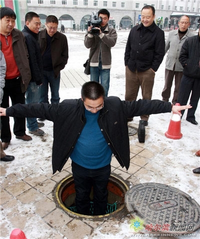 工作人员打开窨井盖后,一年前安装的河北五星电力设备有限公司研制生产的窨井尼龙网,窨井防护网 窨井防坠网 尼龙绳防护网,防护网 生命防护网防护网还完好无损。