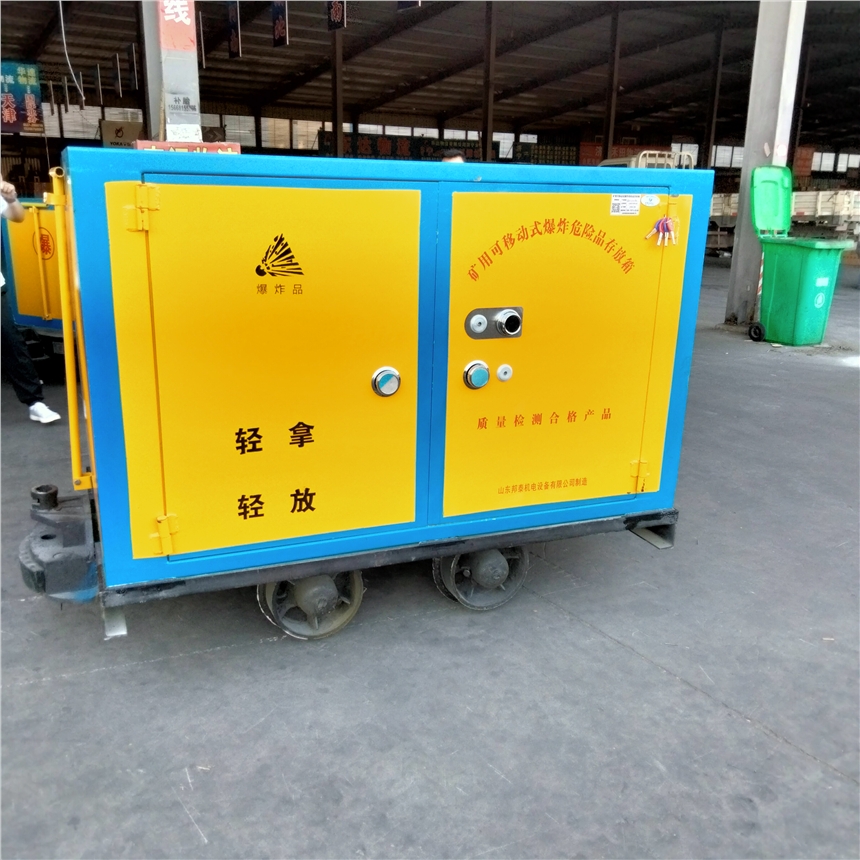 井下运输方式分为有轨运输和无轨运输两种,无轨运输是20世纪中期发展起来的,适合巷道宽敞路面条件好的矿井,对于年久的老矿井,多采用传统的有轨式运输方式,运输物料或者危险品等,适用于有轨式运输危险品的专用车辆,是以存放和运输为一体的形式,材质由优质钢板焊接而成,钢板的厚度一般为6-8mm厚,内里是一层绝缘材质的木板和防火阻燃毡垫,毡垫也起到一定的防震作用,对里面的危险物品起到保护效果,以免驶过路况不好的颠簸路段容易造成运输物品的磕碰损坏。