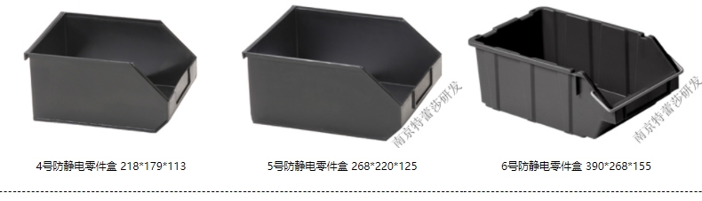 防静电元件盒也称为零件盒,用于机械、汽车、家电、轻工、电子等行业,能、,,可用于盛放食品,清洁方便,零件周转便捷、堆放整齐,便于管理。 其合理的设计,优良的品质,适用于工厂生产中的运输、配送、储存、流通加工等环节。元件盒可与多种物流容器和工位器配合,用于仓库、生产现场等多种场合 在生产现场管理越来越被广大企业重视的今天,元件盒帮助完成元件存放的通用化、一体化管理,是生产及流通企业进行现代化物流管理的产品。 根据用途可分为 1、防静电元件盒, 2、导电元件盒, 3、阻燃元件盒, 4、零部件元件盒, 5、IC元件盒, 6、普通元件盒, 7、红色不良品元件盒, 防静电元件盒根据结构性能可分为 1、可堆式元件盒、 2、可挂式元件盒、 3、翻盖式元件盒, 4、带盖元件盒。 5、斜口元件盒 6、平口元件盒(又称方口元件盒) 7、抽屉式元件盒 8、带数码抽屉式元件盒 防静电元件盒根据物理性能可以分为 1、防静电:表面阻值10的6次方至10的9次方 2、导电:表面阻值10的6次方以下 3、绝缘:表面阻值在10的12次方以上唉灵武防静电周转车_盘锦防静电零件盒-南京特蕾莎