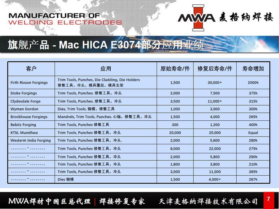 MWA旗舰产品高回收率铬/钴/铁基焊条Mac Hica E3074,设计独特,性能远超标准钨铬钴合金焊条(司太立焊条),比如G6和G21。设计用于对抗所有四个磨损元素,即热、冲击、腐蚀和磨损,尤其是抗冲击性能。钼的加入细化了晶粒结构,产生了良好的热硬度。用最小的母材稀释度重建拐角的卓越选择。能堆焊广泛的区域而不开裂。在高温下保持硬度。焊缝可加工,在冲击下会加工硬化。推荐用于钢铁行业。最初设计为一种锻造材料,用于修理或开模。适用于剪切刀片和模具等要求具有良好耐热性、耐冲击性、耐腐蚀性,以及耐磨性的所有应用场合。由于其卓越的抗冲击性能和精练的晶粒结构,E3074非常适合于剪切工具、锻造冲头/凸模、切边模等。