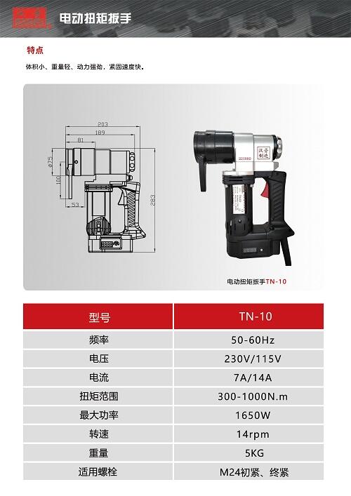 汉普电动扭矩扳手TN-10是一款扭矩范围大、初终紧一体的数显电动扭矩扳手,适用于桥梁、冶金、电力、厂房等钢结构设施的施工。德国进口电机,日本、德国进口轴承,功率大、体积小。锻造铝合金构件,坚固耐用,稳定性强。数显控制器,重复精度高。净距短,像钢箱梁的U肋,这款电动扭矩扳手就可轻松作业。