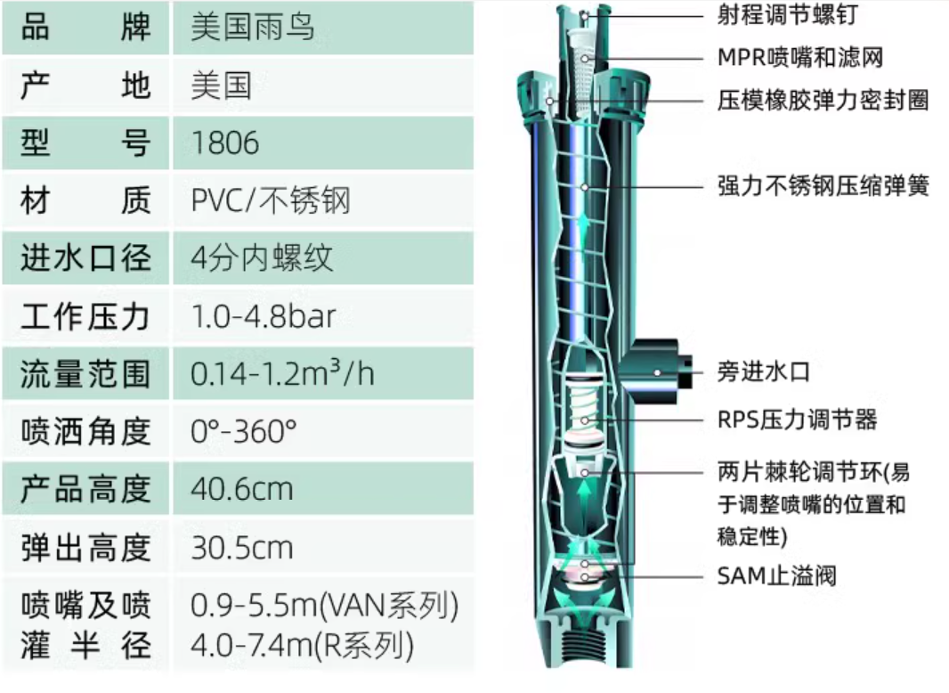 1800系列地埋散射喷头适用用于复杂小块草坪、花圃、灌木等灌溉。
