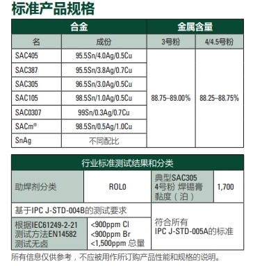 合金 铟泰公司生产用各种无铅合金制成的低氧化物含量的球形 粉末,涵盖很广的熔点范围。3号粉和4号粉是合金的标准 尺寸。其他合金可应求提供。金属比指的是焊锡膏中焊锡 粉的重量比,数值取决于粉末形式和应用