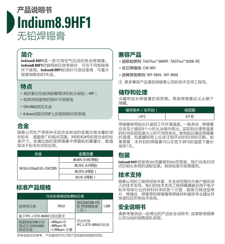 Indium8.9HF1是一款可用空气回流的免洗焊锡膏。 Indium8.9HF1的钢网转印效率极好,可在不同制程条 件下使用。Indium8.9HF1的探针可测试度高,可最大 程度地降低ICT失误。