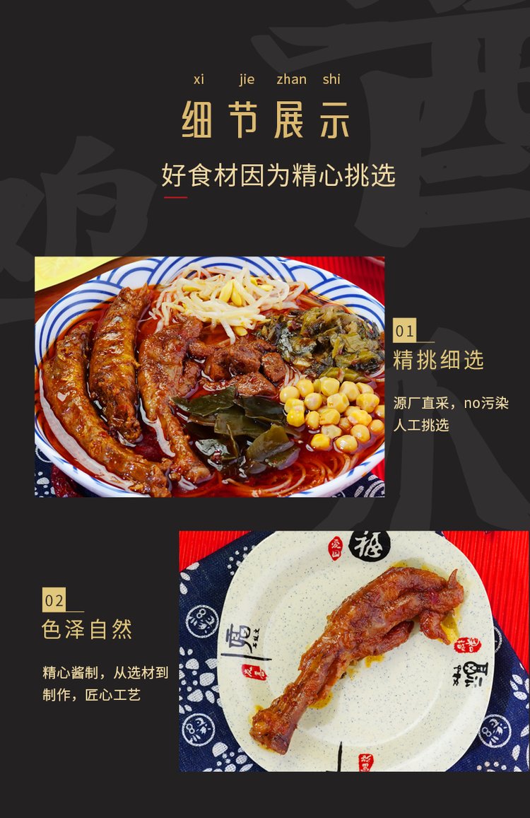 原料与配料 | 鸡爪、食用盐、白砂糖、麦芽糖浆、食醋、植物油、酿造酱油等 | ||