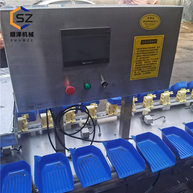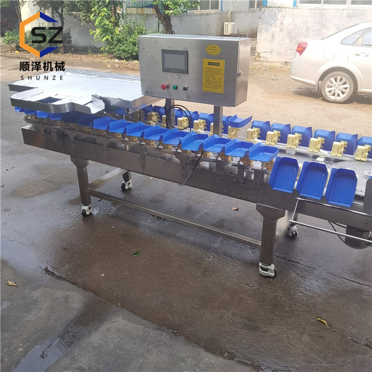 料盒/转盘式重量分选机主要适用于禽类副产品、海产品以及畜牧类副产品的分级,如鸡腿、鸡翅、鸡块、鸡爪、鸭脖、鸭掌、鸭翅、海参鲍鱼、鱼虾、生蚝、牡蛎、扇贝、螃蟹、猪肉块、牛肉块等;高效取代人工分选,在节省人工成本的同时,大大提高产品的标准化程度,带来更多的产品溢价空间和议价能力。工作原理:利用精密动态称量技术,按产品重量大小分选等级将产品的重量称量存储,并利用数据筛选原理进行分级,将不同重量的产品分选到不同区域,实现连续、自动分类。