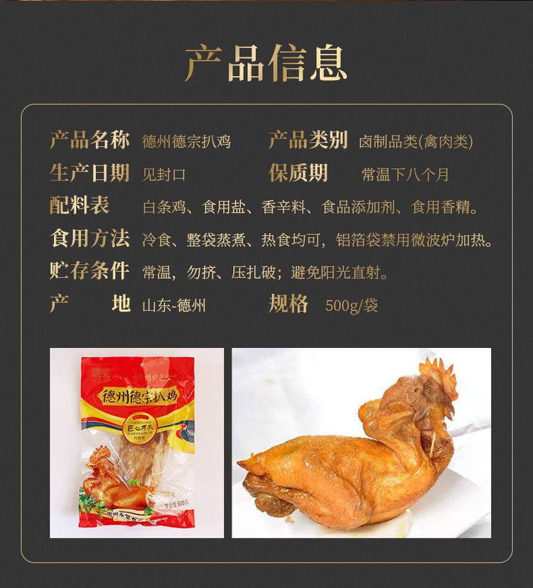 配料表 | 白条鸡、食用盐、香辛料、食品添加剂(乳酸钠、三聚磷酸钠、脱氢乙酸钠、亚硝酸钠),食用香精 | ||