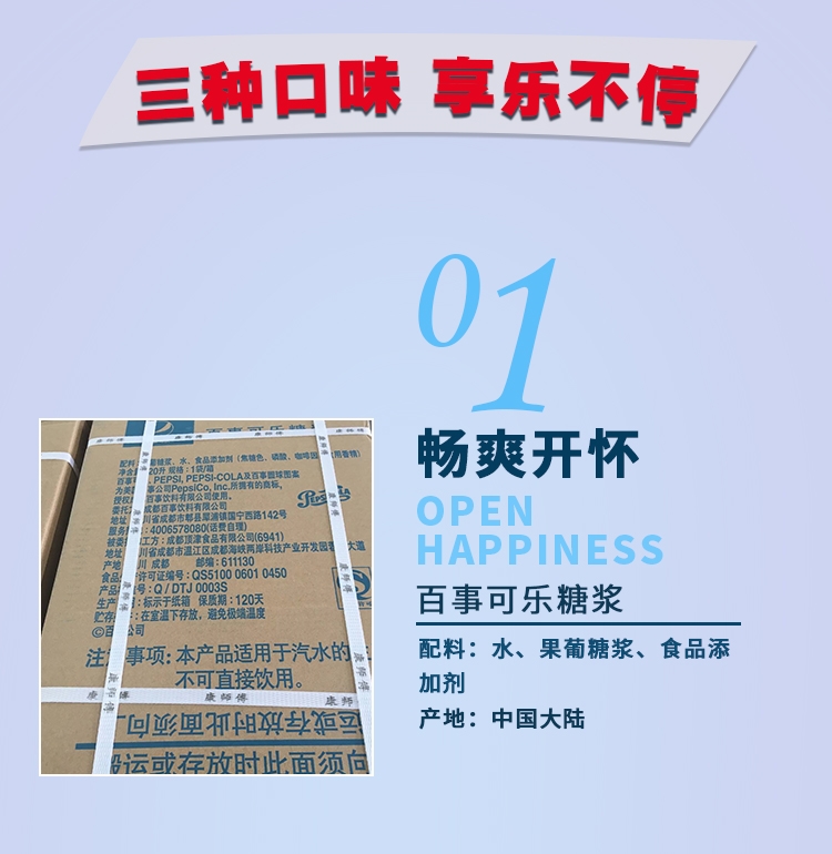 百事糖浆,分为可乐糖浆,七喜糖浆,美年达糖浆。规格分别为20L和10L.