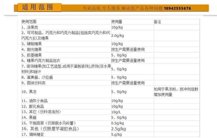 食品:用于糖果巧克力包衣,凉果,膨化食品,口香糖,无甜味剂型固体饮料和浓缩型固体饮料,含乳液体饮料,话化类,果酱,沙拉酱,蛋黄酱。