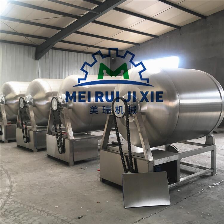 大型真空滚揉机 全自动真空滚揉机主要由滚筒和架体组成,设备工作时,电机带动滚筒转动,真空泵实现抽真空,主要是将加工的肉类,如牛肉,羊肉,鸡肉,鸭肉,鹅肉,猪肉,鱼肉,蛋及蔬菜,果品放在真空状态内,滚动摔打实现快速腌制,也提高调味品进入肉品的速度,并更好的保持肉内的水分。