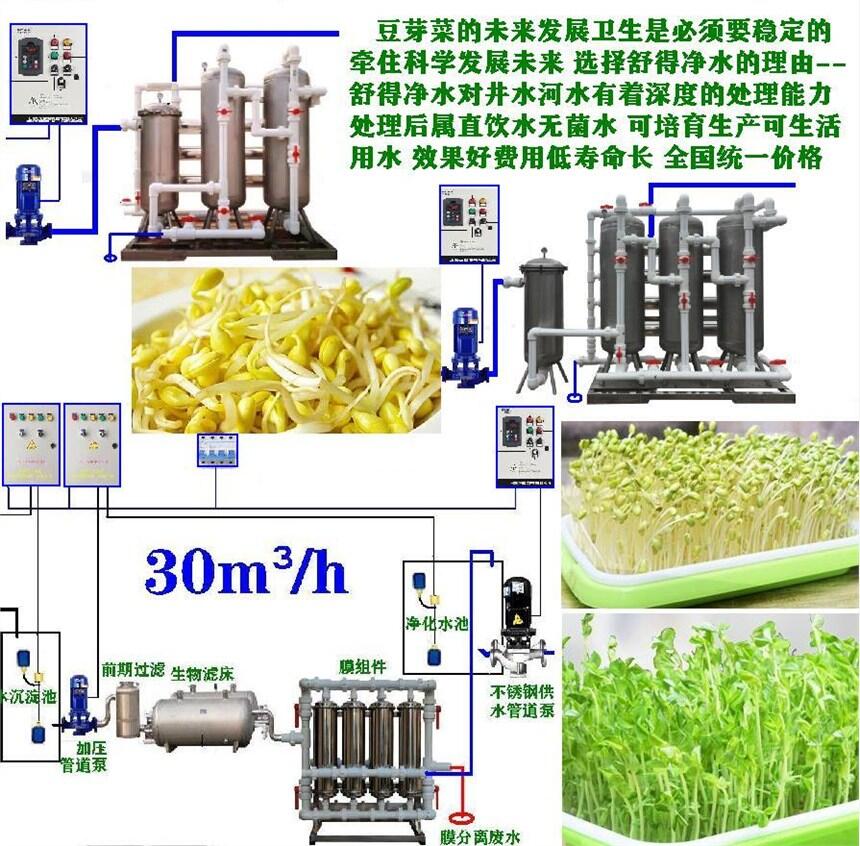 我们是舒得水处理设备生产厂家、业生产净化自来水井水河水的深度净化水处理设备、净水设备大小规格齐全,自来水也好井水也好河水也好经过舒得净水机处理后都是标准的矿化水直饮水纯净水也是无菌水、用这样的水生长出来的各种豆牙菜不会给您带来任何损失而只会给您带来利益、因为卫生提高上去了效益能差吗对吧。希望全国生产豆牙菜的生产基地生产厂家考虑配置舒得牌大型净水器、目湖北省有多家配置了我们的设备用于井水净化来生产各种豆牙菜、特别是武汉市那边用的比较多、全国吃到他们生产的各种豆牙菜得感谢他们因为他们确实走近步。下面给大家介绍介绍净水设备的情况;
