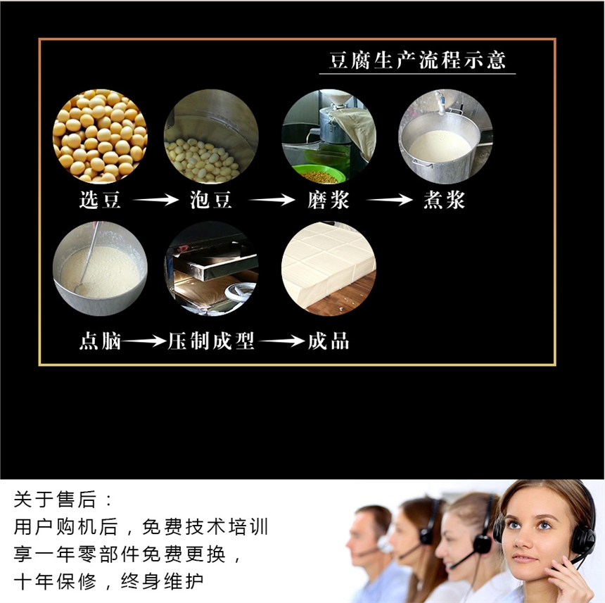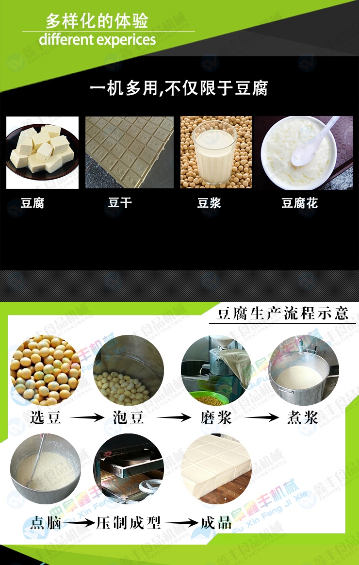 豆腐机一机多用,可同时生产豆浆、豆花、各式豆腐等多种豆制品,还可以与其他设备和工艺配套生产更多的豆制品。方便快捷,从大豆原料进机到出成品仅需25分钟,并且一台设备只需一人操作,省时省工省力,轻松便捷。洁净卫生,符合食品卫生标准的全不锈钢生产设备,整洁光滑易清洗。