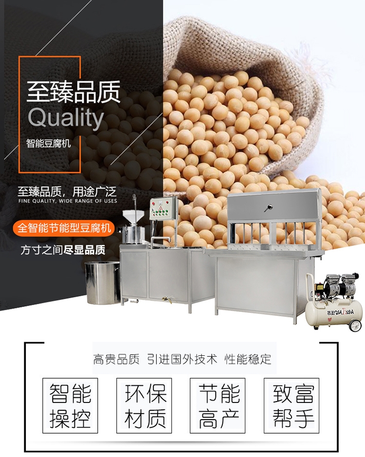 与传统的做豆腐的方法相比,现在豆腐机的使用会提高更高的效率,节省很多的时间。豆腐机是把大豆做成豆腐,豆浆等一些豆制食品的机械。豆腐机由分离式磨浆机、盛浆桶、盛渣桶、蒸汽包等组成,自动加水由液位控制器和电磁阀控制蒸汽包水位。可同时生产豆浆、豆花、各式豆腐等多种豆制品,还可以与其他设备和工艺配套生产更多的豆制品。