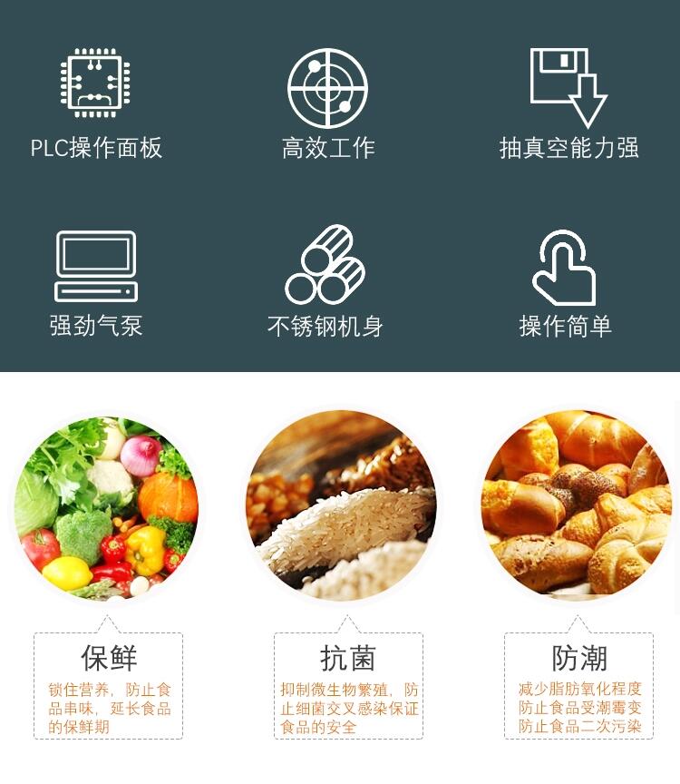 6.功能:连续滚动式真空包装机是我公司新研制的一款节能型真空包装机。该机采用凸轮分度器传动,以凸轮分度器代替了传统的电机,设备操作人员无须手动调整传送带位置,更省时省力;这种传动方式是传统的连杆传动方式不可比的。气动连续滚动真空包装机取代了电机,节省了电能,操作后台不用进行特殊保护,不用担心电机被烧毁,无污染,绿色环保更节能。整机可倾斜四种角度,可满足各种包装要求。