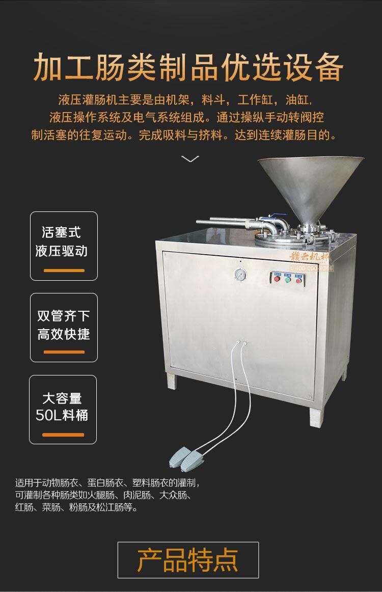 赣云液压灌肠机,新款灌浆机,双管灌肠机采用液压灌浆推料原理设计,密封性能良好,配合双管灌浆,可自动调节灌浆,自动吸料,脚踏开关控制操纵自如。是肠类灌肠设备。