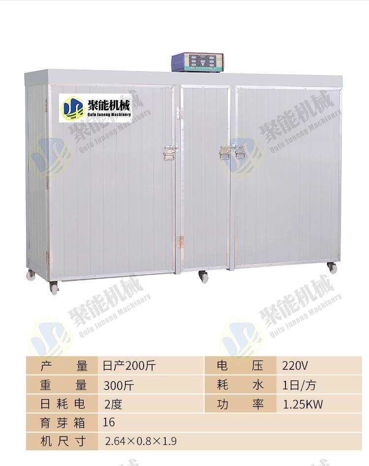 4、箱体全夹层保温,水箱内置,保证了生产环境的恒温性,不使用任何添加剂,豆芽生长快速,均匀而饱满,无需专人管理,生产效率高。
