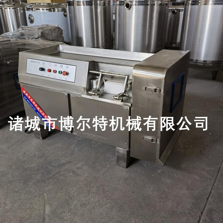冻肉切丁机 猪喉管切条机 鲜肉冻肉切丁机可以实现无骨肉类的切丁加工和果蔬类的产品的切丁加工的,也就是可以当切肉机使用的同时还可以实现切菜机的一个功能的,这款机器对于入料的原材料是有要求的,需要根据入料槽尺寸来确定的,如果是冻盘比较大的产品的话是可以配套冻盘切块机或者是据骨机来使用的。