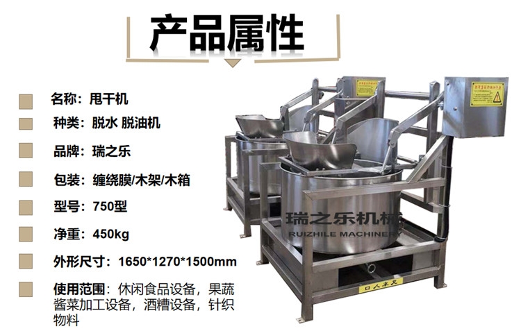 虾仁离心式脱水机 瑞之乐全自动脱油脱水机 750型虾仁甩干水分机:本机采用内筛+外罩的虑式结构,虾仁海鲜水洗过在脱水机内受到强大的离心力,使附着在产品表面的水分被甩出筛网,同时也就甩干了溶解物料里的杂质。甩出的水分残留物也在离心力作用下被水分冲刷掉,随水分流走。