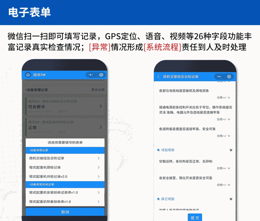 把设备基本信息、合格证、备案资料、验收信息、交底信息、持证上岗、操作规范做成二维码,形成每个设备独立的“设备身份二维码”;扫码即可查看设备的基本信息、保养记录、使用规范、合格证以及历史填写记录;