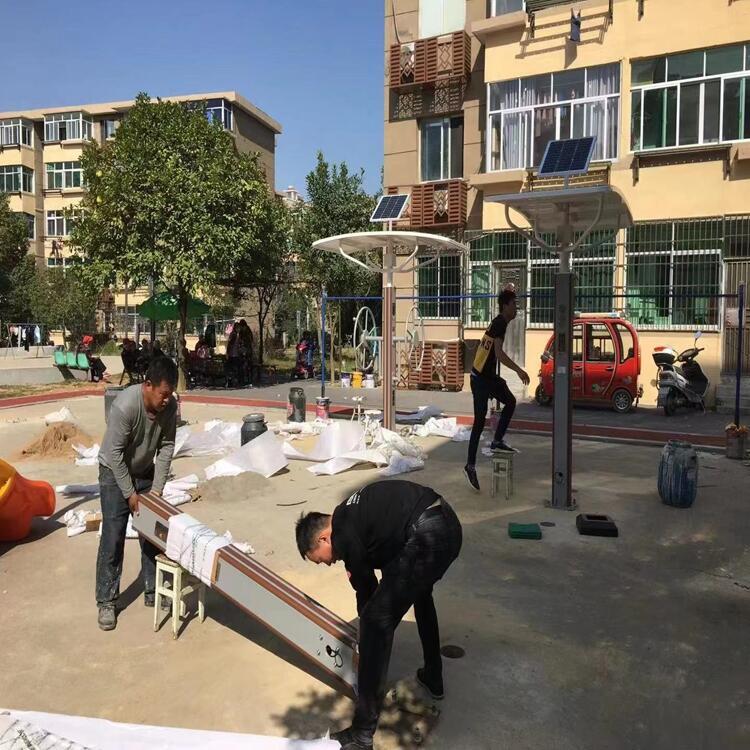 ·顶部装有太阳能板,太阳能系统支架立柱为Φ48×3mm优质钢管,与遮阳棚采用法兰盘连接,?防止雨水浸入造成电路短路烧毁;太阳能板采用单晶光伏板,通过控制器给锂电池充电,一次性充满可使用70小时以上,供给2盏5W的LED灯夜间照明,可以在夜间进行锻炼。