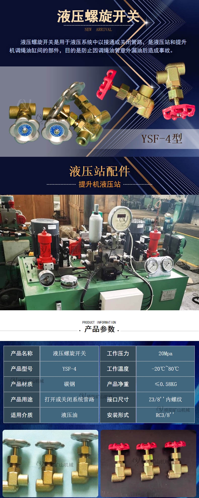液压螺旋开关是用于液压系统中以接通或关闭管路,是液压站和提升机调绳油缸间的部件,目的是防止因调绳油管意外漏油后造成事故。液压站和提升机调绳油缸间的部件,目的是防止因调绳油管意外漏油后造成事故。可加装压力传感器,用以检测管路压力并参与实现报jing和自动控制。