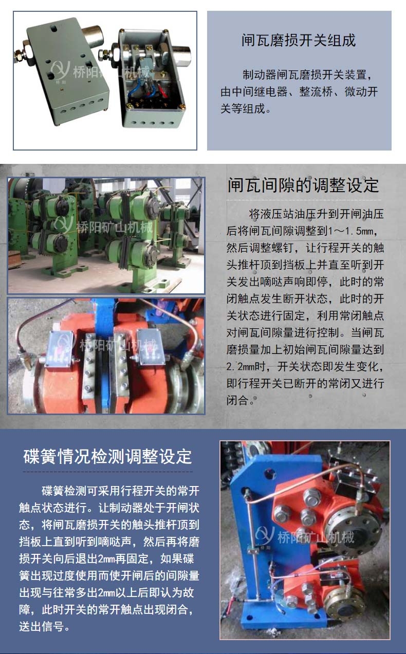 碟簧检测可采用行程开关的常开触点状态进行。让制动器处于开闸状态,将闸瓦磨损开关的触头推杆顶到挡板上直到听到嘀哒声,然后再将磨损开关向后退出2mm再固定,如果碟簧出现而使开闸后的间隙量出现与往常多出2mm以上后即认为故障,此时开关的常开触点出现闭合,送出信号进行报jing。