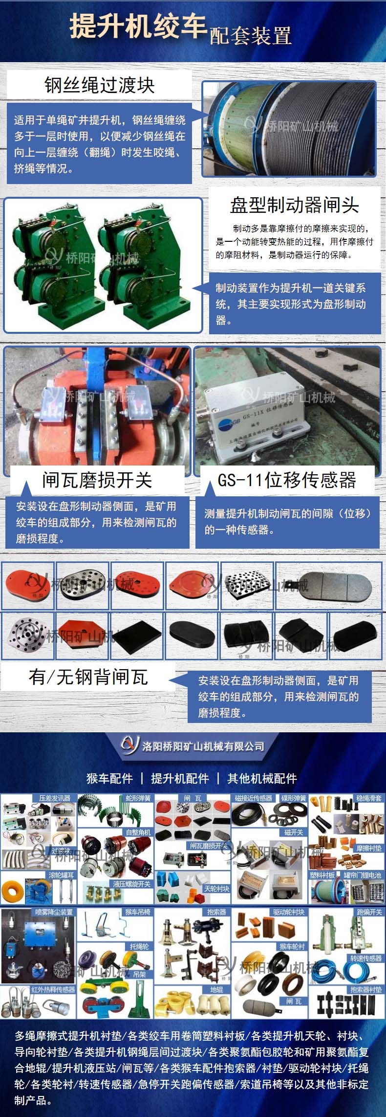 猴车配件、提升机配件以及其他机械配件。其中型号为PS249B的闸瓦磨损开关是主营之一,它根据客户要求可以选择采用的材质是铝或者是树脂。其电压为220V,电流5安,产品别名矿井提升机盘形制动器用闸瓦磨损开关,此配件安装设在盘形制动器侧面,是矿用绞车的组成部分,用来检测闸瓦的磨损程度,绞车的运行。