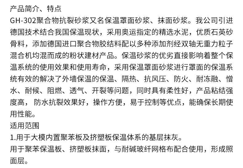 GH-302聚合物抗裂砂浆又名保温罩面砂浆、抹面砂浆。我公司引进德国技术结合我国保温现状,采用奥运的精选水泥,优质石英砂骨料,添加德国进口聚合物胶结料配以多种添加剂经双轴无重力粒子混合机均混而成的粉状建材产品。保温砂浆的优劣直接影响着整个保温系统的使用效果和使用寿命,采用保温罩面砂浆进行罩面的保温系统有效的解决了外墙保温的保温、隔热、抗风压、防火、耐冻融、憎水、耐候、阻燃、透气、开裂等问题,同时具有柔性好,产品粘结强度高, 防水抗裂效果好,操作方便,易于控制等优点,能确保长期使用性能,环保安全。