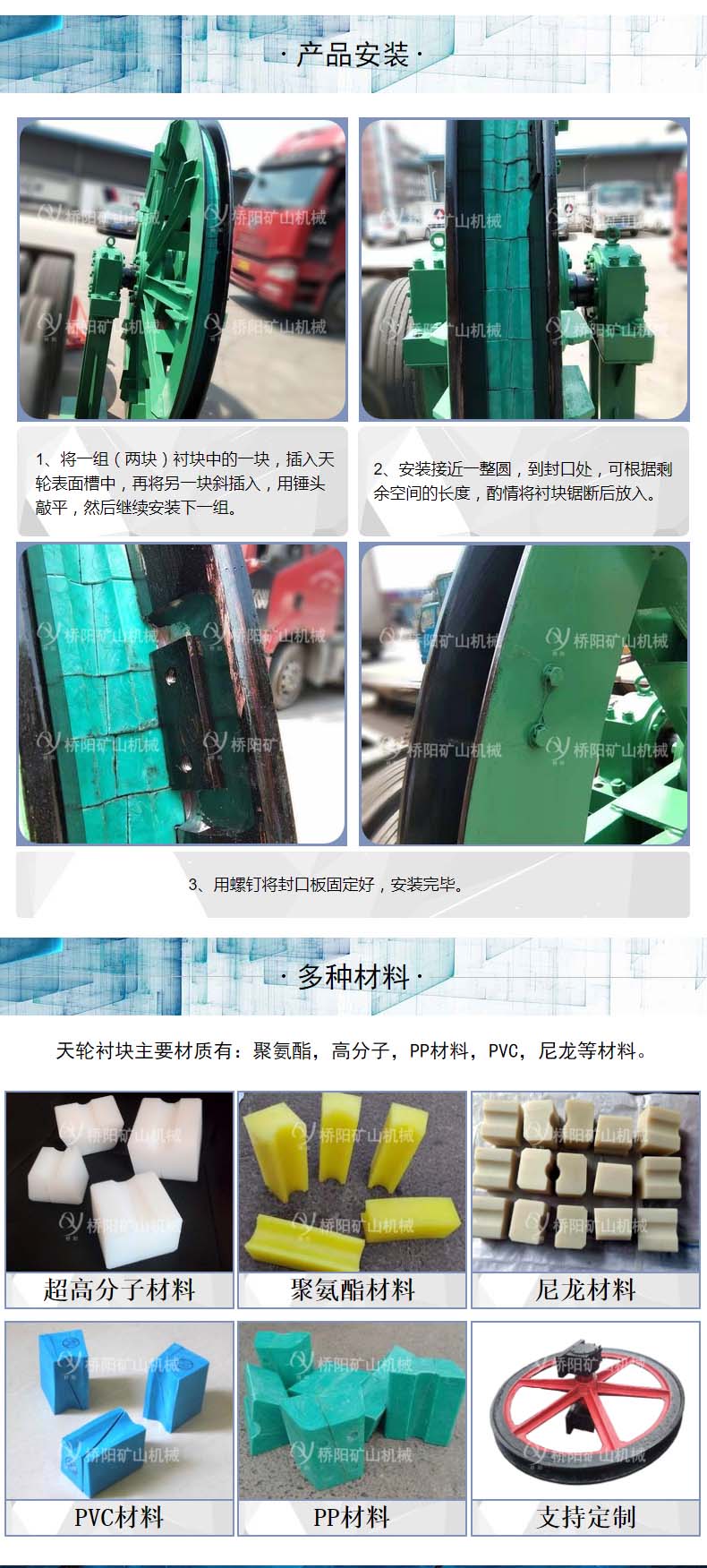 天轮又叫绳轮是设置在井架或暗井顶部,承托提升钢丝绳的导向轮。天轮衬块又称:钢丝绳用导向轮衬块。在天轮上安装衬垫,可避免天轮的磨损,并减少钢丝绳的磨损、延长了钢丝绳的使用周期,从而降低更换天轮和钢丝绳的工作量。